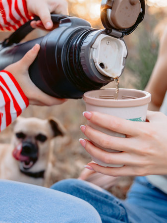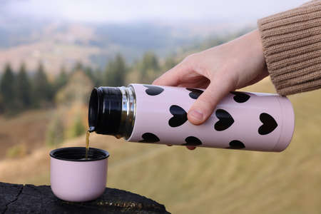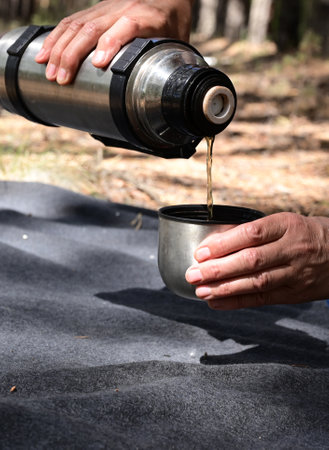 Woman hands pouring tea from into cup. Hot drink break during hiking or camping in autumn or spring time. High quality photo