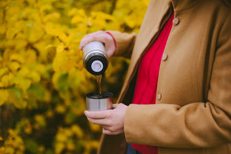 on a morning walk in the autumn park. The concept of an active lifestyle and hiking, warm drinks in the cold season