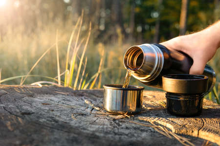 Tourist pouring hot tea out of a thermo flask into two cups standing on a tree stump at sunset. Hiking, traveling and active lifestyle concept