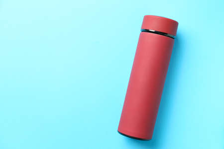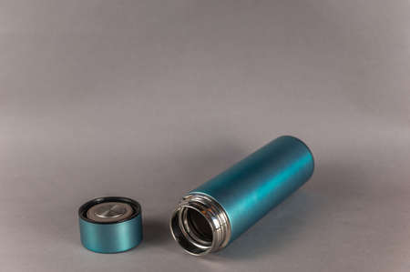 A modern flask with an open lid lies against a gray background. Cylindrical vacuole flask in turquoise color. Container for hot and cold drinks. Equipment for sports, hiking, and travel.