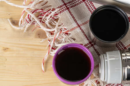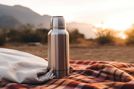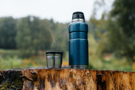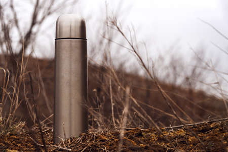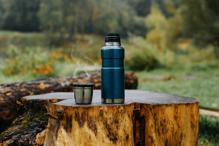 Steel vacuum flask with tea or coffee, outdoor. Hiking, active tourism, picnic, hot drink concept