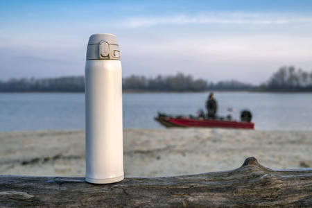 White thermocup on fallen tree on blurred background of fishing boat at river