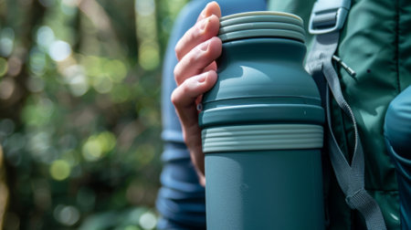 A closeup of a silicone water bottle featuring a unique collapsible design making it perfect for travelling or saving space in a backpack