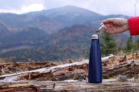 Woman pouring instant coffee into thermo bottle in mountains, closeup. Space for text