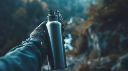 Person Holding Reusable Metal Water Bottle in Cold Mountain Landscape