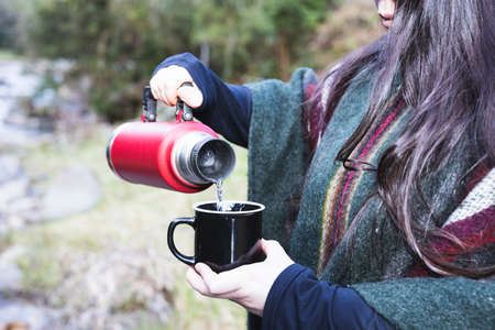 Young woman pouring hot water in a mug. Beside a river. Latin beverage.