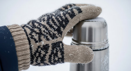 Cozy gloved hand holding stainless steel thermos in snowy weather