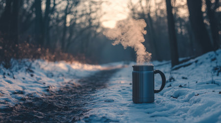 A steaming coffee mug sits on a snowy path in a winter forest, surrounded by tranquil trees and soft morning light, creating a serene atmosphere for reflection and relaxation.