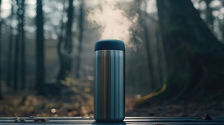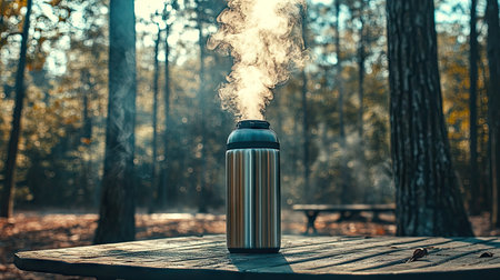 A stainless steel thermos with steam rising from the top, resting on a picnic table in a forest clearing.
