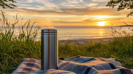 A stainless steel thermos mug with steam rising, placed on a picnic blanket by the sea at sunset, creating a serene coastal vibe.