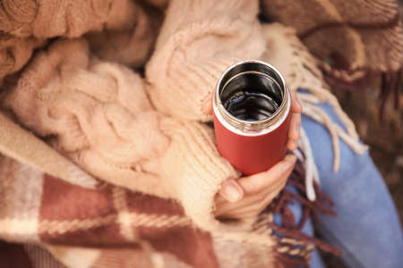 Hands of girl with thermos pours hot tea into mug on meadow on background of trees at misty morning. Girl with red hair in warm blanket in haze.