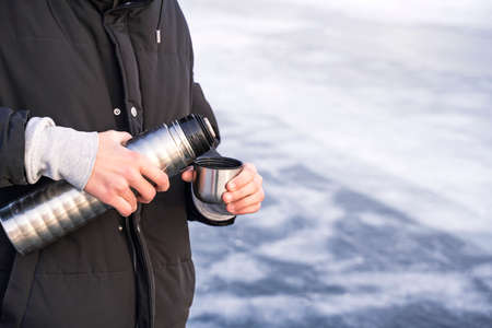 Young man, teenager pours and drinking the hot tea from thermal bottle at the winter's beach of the cold frozen lake Baikal, people and healthy lifestyle concept.
