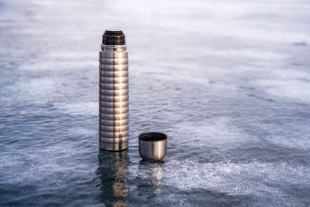 Open thermal cup on the ice of Lake Baikal. coffee break