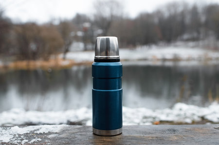 Vacuum travel flask standing on wooden table outdoors. Steel flask on background winter lake, close-up.