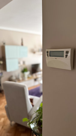 In a modern living room, a house thermostat takes center stage, symbolizing the care for both home comfort and the environment. With smart technology, controlling the temperature becomes an eco-conscious choice, ensuring comfort while minimizing energy waste