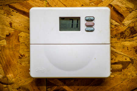 Thermostat on a wall reading 71 degrees Fahrenheit. Selective focus, background blur and foreground blur