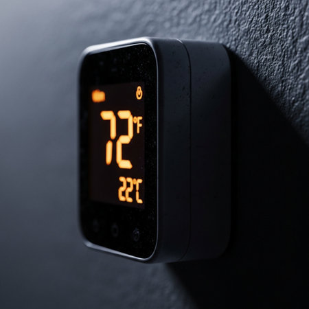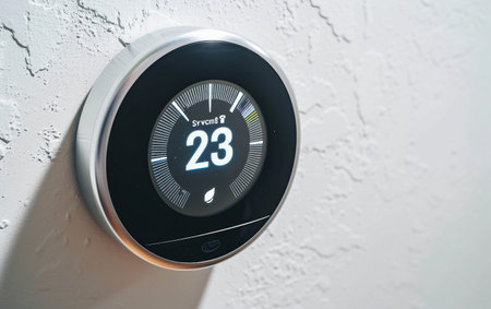 A modern smart thermostat mounted on a sunlit wall, efficiently managing the home's climate.