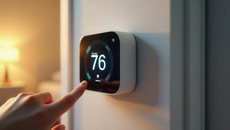 Close-up of a hand interacting with a smart thermostat mounted on a wall, showing a temperature of 76 degrees. Warm lighting and a cozy home interior in the background.