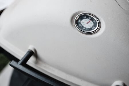 Focus on the thermometer of a hot BBQ barbeque with the lid down