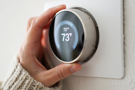 Hand adjusting a smart home thermostat to control temperature and save energy.