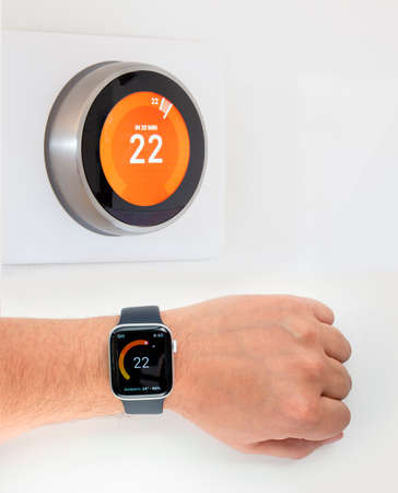 A person checking the room temperature with a smart watch connected to a smart thermostat.