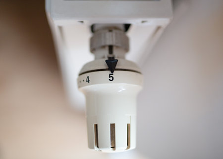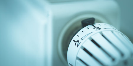 Close-up of a thermostatic temperature control valve on a radiator. Concept of energy efficiency, temperature regulation, and home heating.