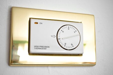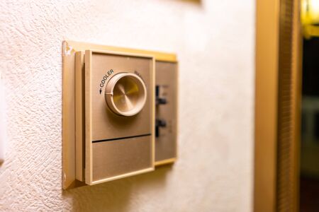 Temperature control panel of central air condition on the wall in modern luxury hotel bedroom.