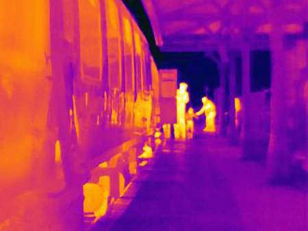 The image from thermal imager device. human heatmap. Blurred unrecognizable people.
