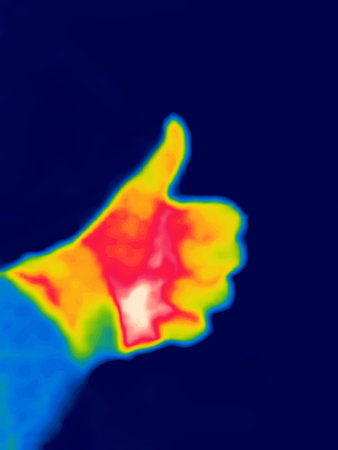 This striking thermal image showcases a human hand in vibrant colors against a contrasting background, highlighting temperature variations and artistic flair.