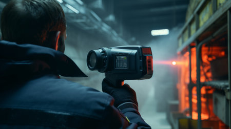 A worker wearing helmet and protective clothing using thermal camera for infrared leak detection industrial piping, focused inspection