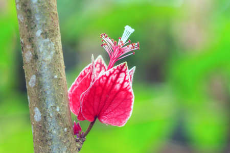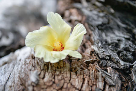 Beautiful close up macro of a small tropical pink flower (possibly hibiscus) growing from the wood of a tree trunk