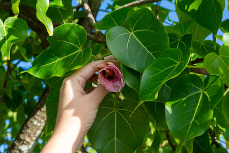 Green leaves of a plant with a hand touching the pink flower. Sky in the background. Salvador, Bahia, Brazil.