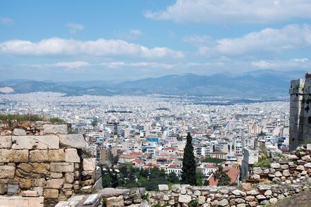 Ancient Greek ruins, ruins amidst lush green grass. Acropolis, Athens, Greece. Beautiful view of the capital of Greece - Athens from the slopes of the Acropolis on a hot sunny day.