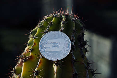 Digital currency physical metal silver metal dash coin. Cryptocurrency concept.