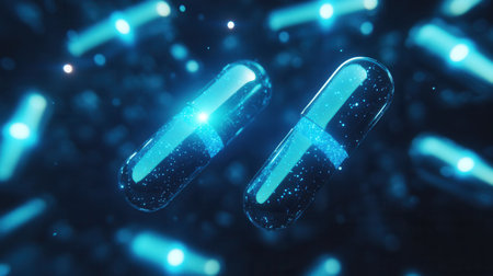 Soft blue light radiates from glowing capsules in a dark setting, showcasing an abstract, futuristic medical theme with a cinematic feel.
