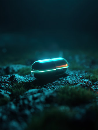 A luminous abstract pill rests on moist ground, surrounded by a dark sterile atmosphere while soft glowing reflections create an otherworldly ambiance.