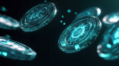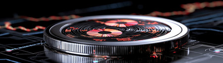 A striking close-up of a modern digital coin resting on a futuristic background featuring data visualization elements, perfect for tech and finance themes.
