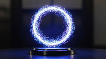 Neon glowing circle on pedestal, 3d rendering. Computer digital drawing.