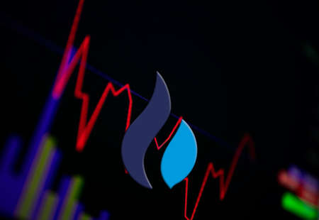 OKB cryptocurrency logo on the screen of smartphone in mans hand with downtrend on the chart on a red light background, February 2022, San Francisco, USA.