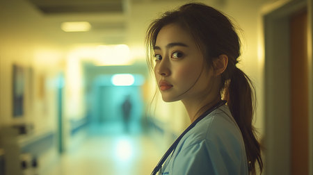 photo of an Asian woman model in a nurse's uniform, side view, hospital corridor blurred in the background, soft clinical lighting, focus on her calm and composed expression, advertising shoot, professional photo, photorealistic --chaos 10 --ar 16:9 --v 6.1 Job ID: 3c2f6085-efb1-4d0e-8977-c4c4a17342b3