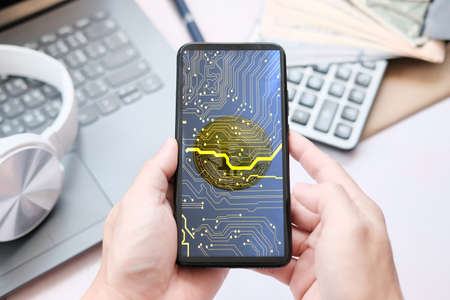 Man holding smartphone with chip on screen, closeup. Cryptocurrency mining