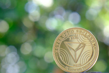Digital currency physical golden bitcoin coin on blurred bokeh background.