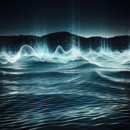An abstract landscape features glowing, wave-like lines of light over a beach. The composition showcases cool tones of blue and purple, and the lines reflect on the wet sand. A dark silhouette of a mountain lies under a colorful night sky. Suitable for conceptual art or design projects.