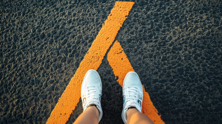 A person is standing on a road with a white line and orange line. The person is wearing white shoes and is looking down at the ground