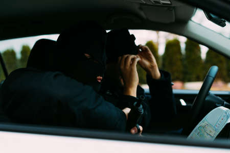 bank robbers putting their mask on prepared to do their next robbery,checking and loading their guns.