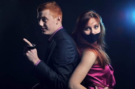 Super agents, a gorgeous blonde in a black evening outfit and a man with a gun behind her back. A luxurious couple in black in the spotlight, spy or noir style