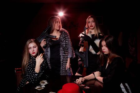 Kirov, Russia - December 19, 2018: Group of girls with playing cards near table in a dark room with red light. Photo shoot in gangsters style