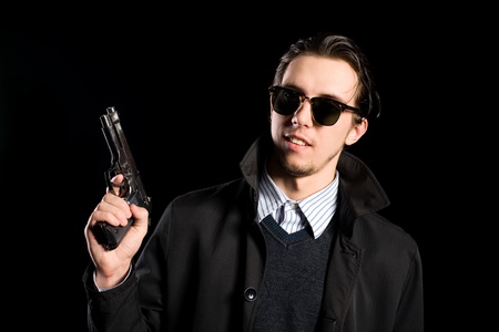 Handsome detective in trench coat holding a gun in the dark. Noir film style. Black and white photography
