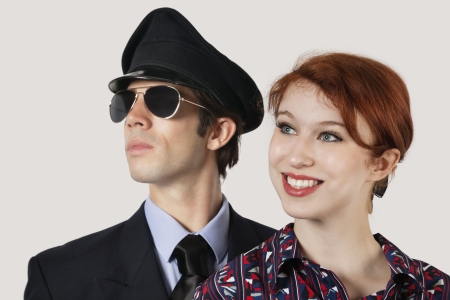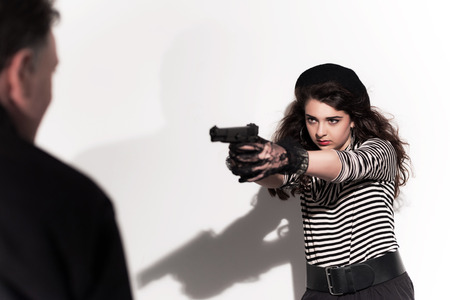 Portrait of the man in a hat with a pistol and the beautiful woman. In style of a retro.