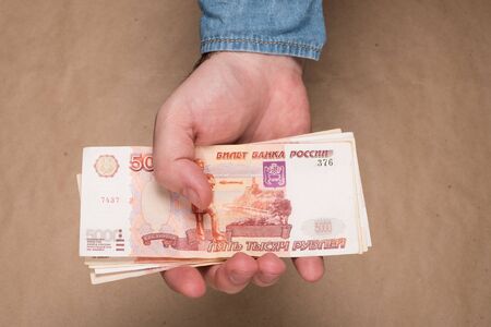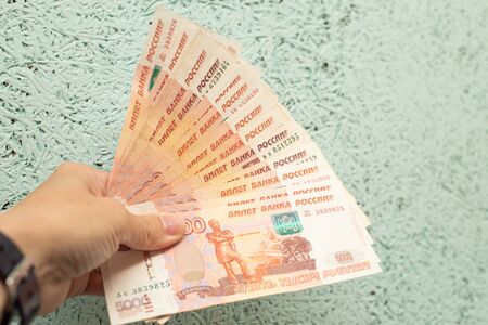 Russian rubles in the hand of a fan.male hand holding many of the Russian banknotes.The transfer of money.The isolated five-thousandth of Russian rubles denominations in a hand.